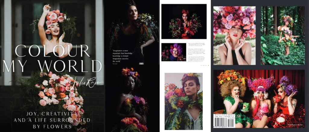 With every turn of the page, you’ll be transported into Julia’s artistic sanctuary, where flowers transform into paint, fabric, and inspiration. Julia shares her intimate creative journey, from conceiving intricate pieces within her mind’s eye to skillfully translating her visions into tangible, ephemeral masterpieces that capture the essence of fleeting beauty.